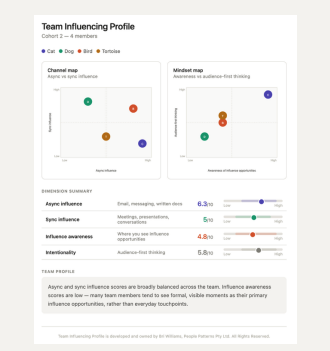 The Team Influencing Profile only takes 5 minutes to complete and each person gets immediate results and basic feedback. I then debrief the team leader and team on what it means. You can see sample output here. Get in touch if you'd like to hear more.